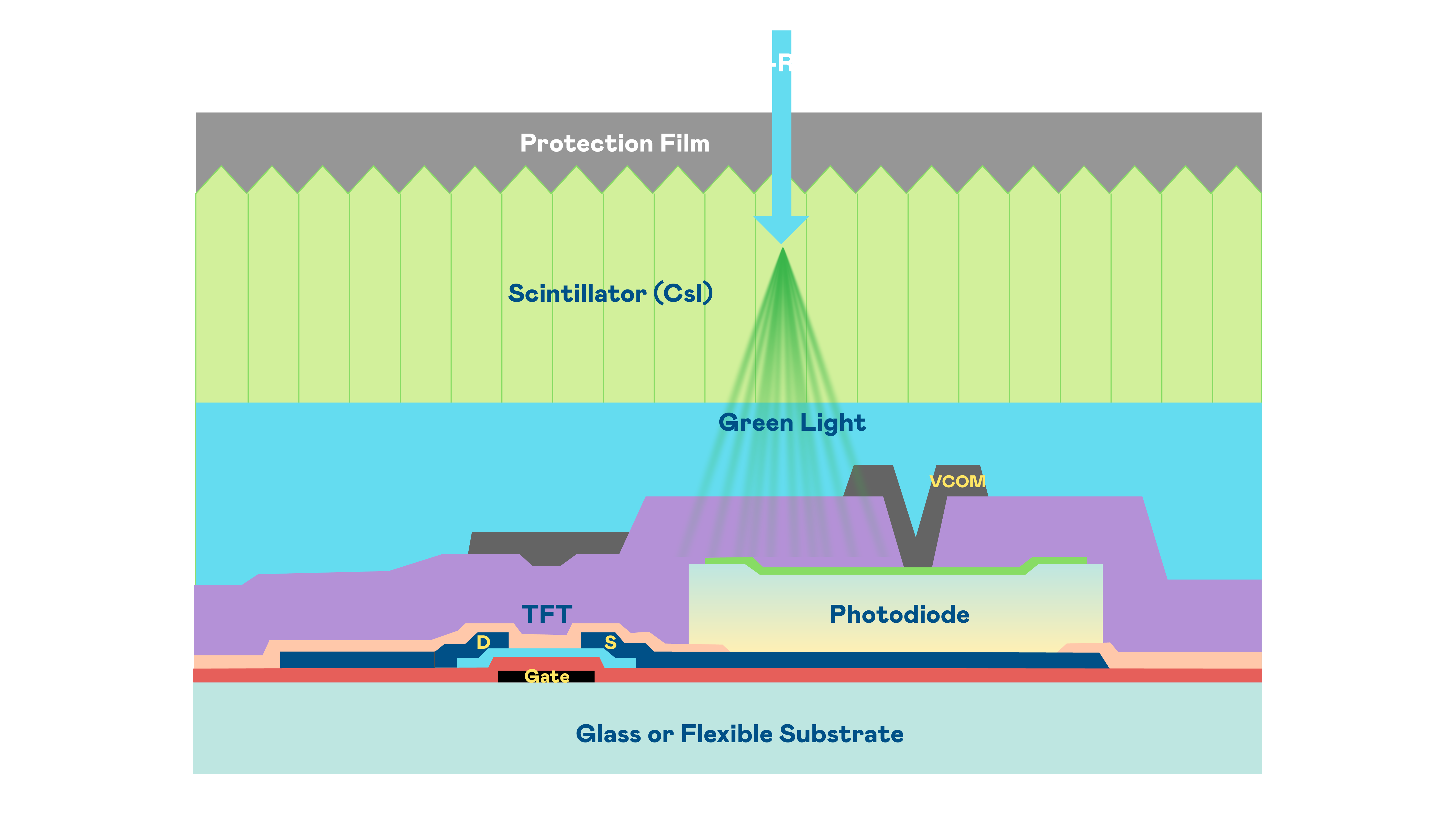 哈希游戏的X光影像感测阵列使用薄膜电晶体 (TFT) 作为每个像素的读取开关,搭配光电二极体(Photodiode)的光电转换元件,用以感测X光影像讯号。